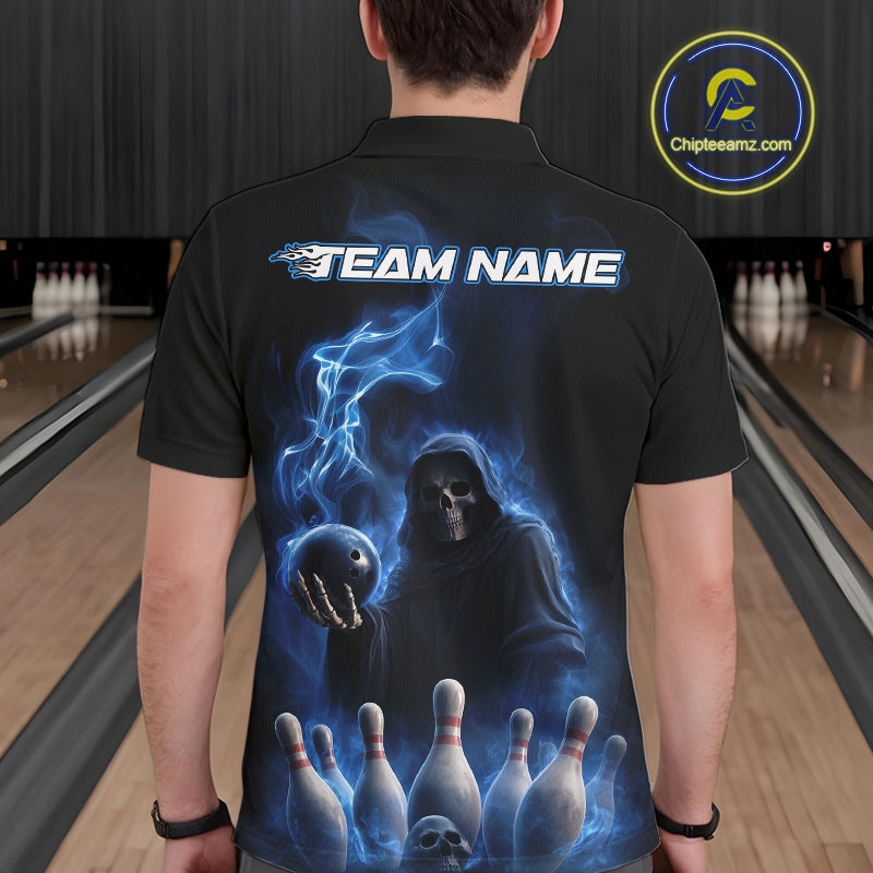 Custom Blue Flame Grim Reaper Bowling Men Polo Shirts, Skull Halloween Bowler Outfit IPHW9734