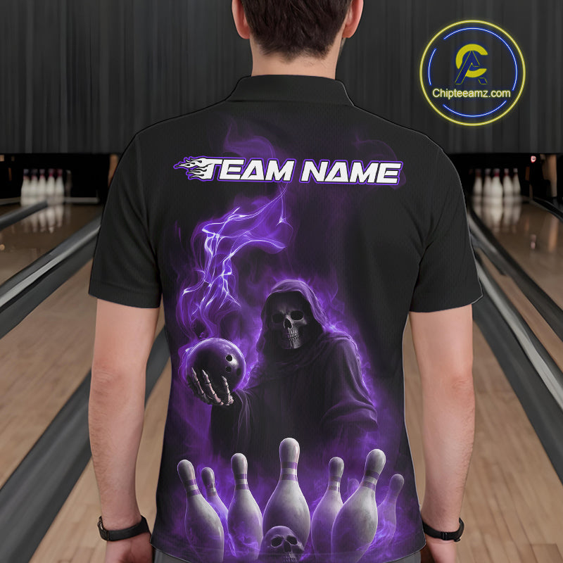 Custom Purple Flame Grim Reaper Bowling Men Polo Shirts, Halloween Bowler Outfit IPHW9737