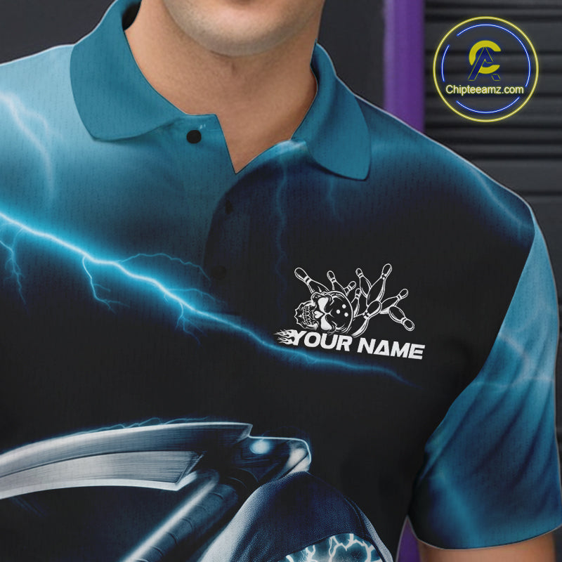 Custom Blue Lightning Grim Reaper Bowling Polo Shirts For Men, Halloween Bowling Jerseys IPHW9843