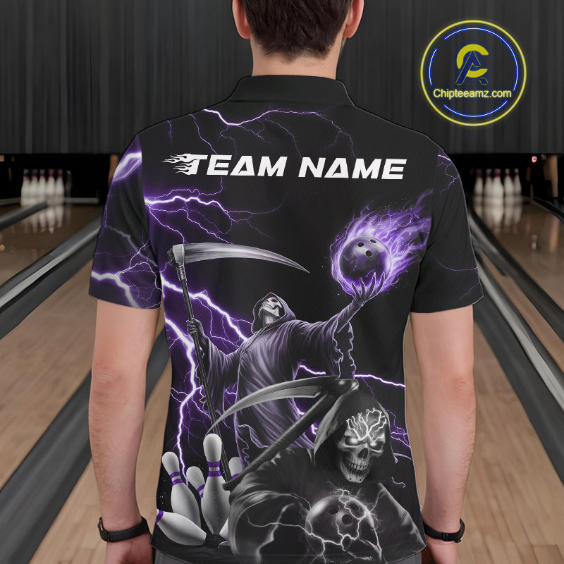 Custom Purple Lightning Grim Reaper Skull Bowling Men Polo Shirt, Halloween Outfit IPHW9849