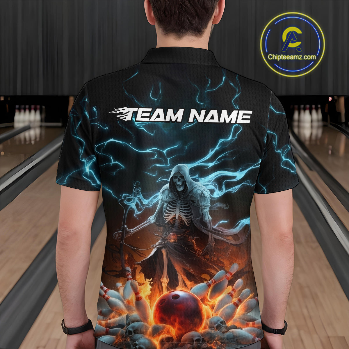 Custom Blue Lightning Grim Reaper Bowling Men Polo Shirt, Flame Halloween Outfit IPHW9899