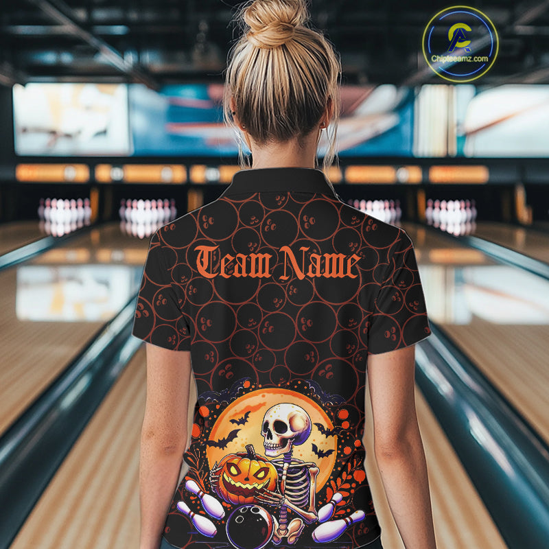 Custom Funny Skeleton Bowling Polo Shirts For Women, Halloween Bowling Team Outfit IPHW9604