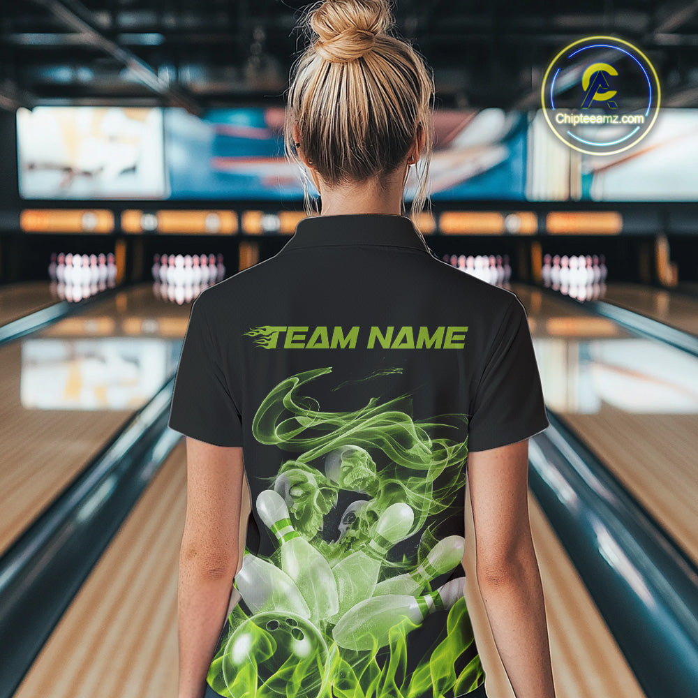 Custom Green Skull Smoke Bowling Team Women Polo Shirts, Halloween Bowling Outfit IPHW9773
