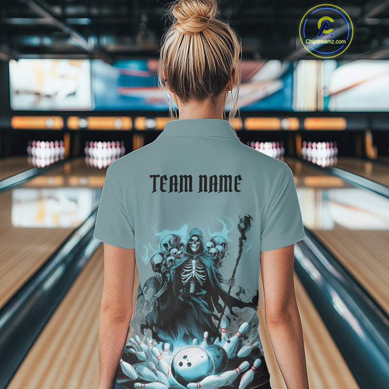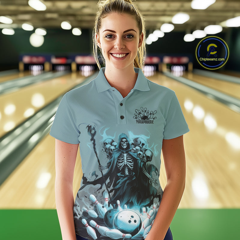 Custom Blue Flame Grim Reaper Bowling Women Polo Shirts, Piles Of Skull Halloween Outfit IPHW9897