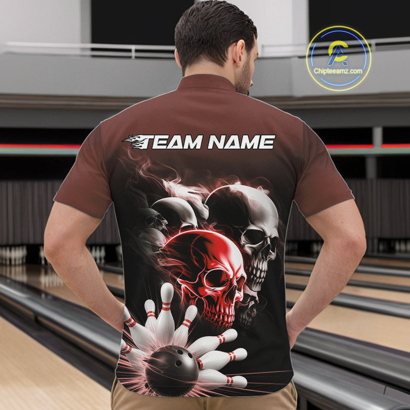 Custom Red Smoke Skull Bowling Quarter-Zip Shirts For Men, Ghostly Halloween Bowling Outfit IPHW9520