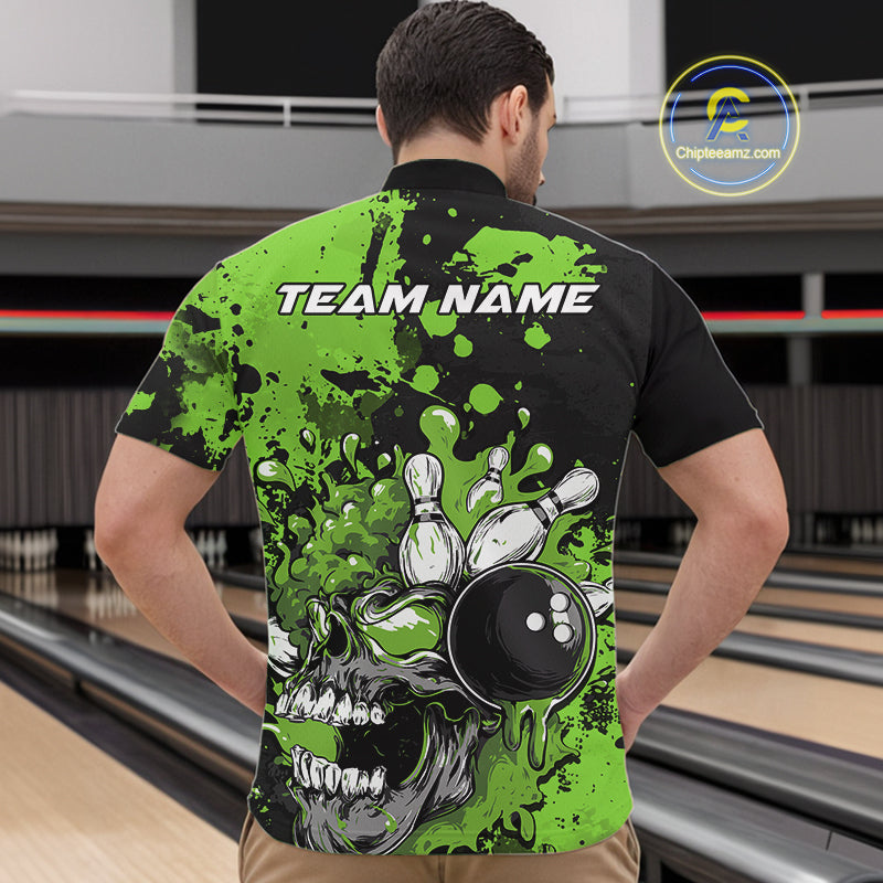 Custom Black And Green Splatter Skull Bowling Team Men Quarter-Zip Shirt, Halloween Outfit IPHW9728