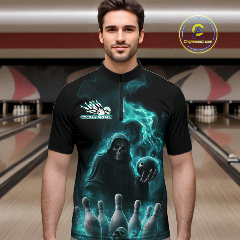 Custom Turquoise Blue Flame Grim Reaper Bowling Men Quarter-Zip Shirts, Halloween Bowler Outfit IPHW9736