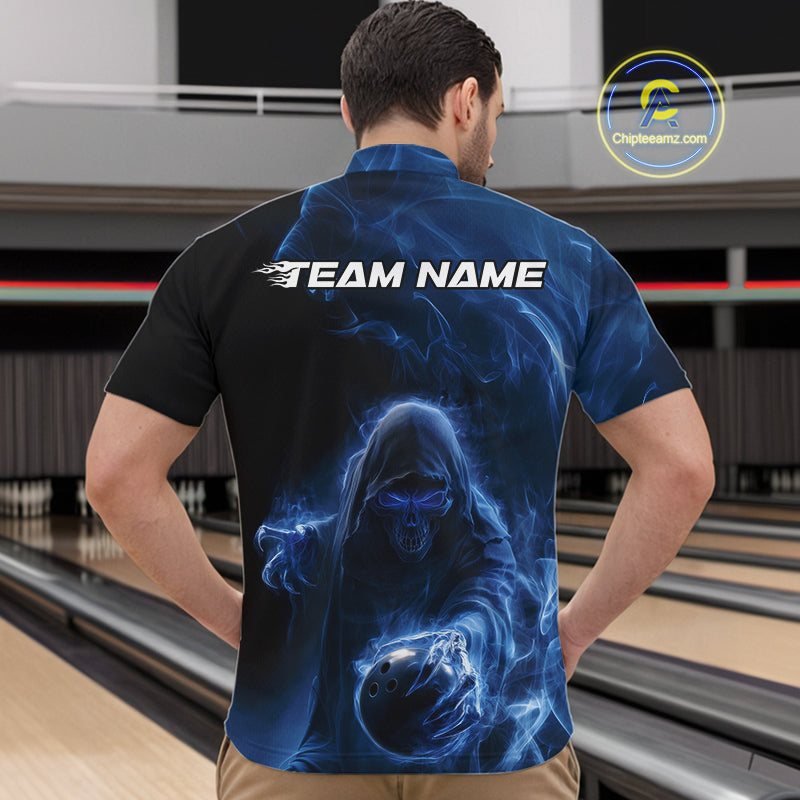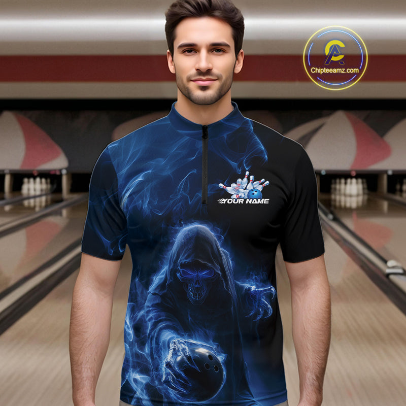Custom Black And Blue Smoke Flame Grim Reaper Halloween Bowling Men Quarter-Zip Shirts IPHW9739
