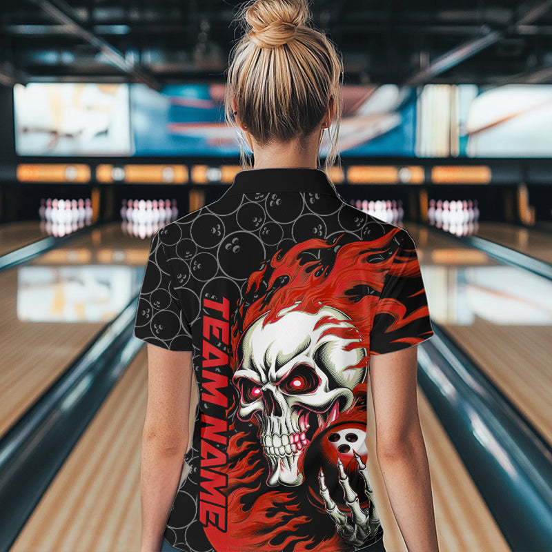 Custom Black And Red Flame Skull Bowling Women Quarter-Zip Shirts, Halloween Bowling Outfit IPHW8777