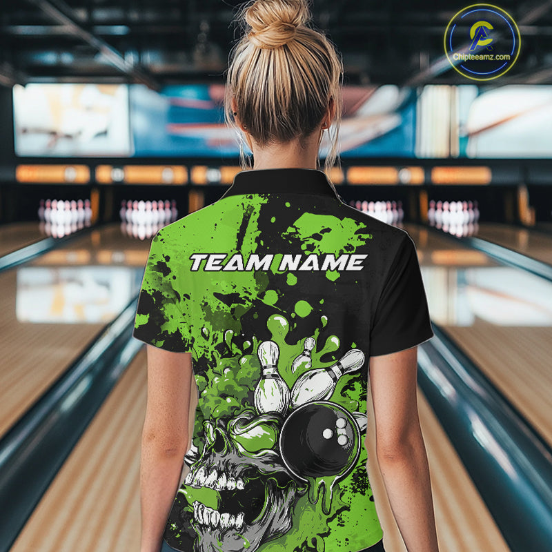 Custom Black And Green Splatter Skull Bowling Women Quarter-Zip Shirt, Halloween Outfit IPHW9728