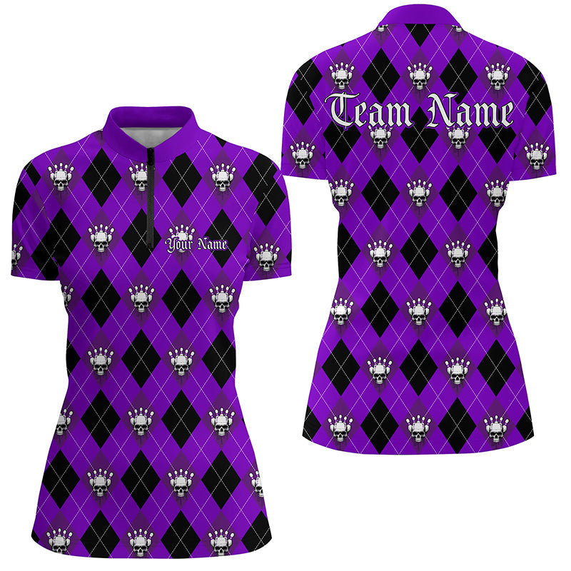 Purple Argyle Pattern Custom Skull Bowling Shirts For Women, Halloween Outfit Bowling IPHW7301