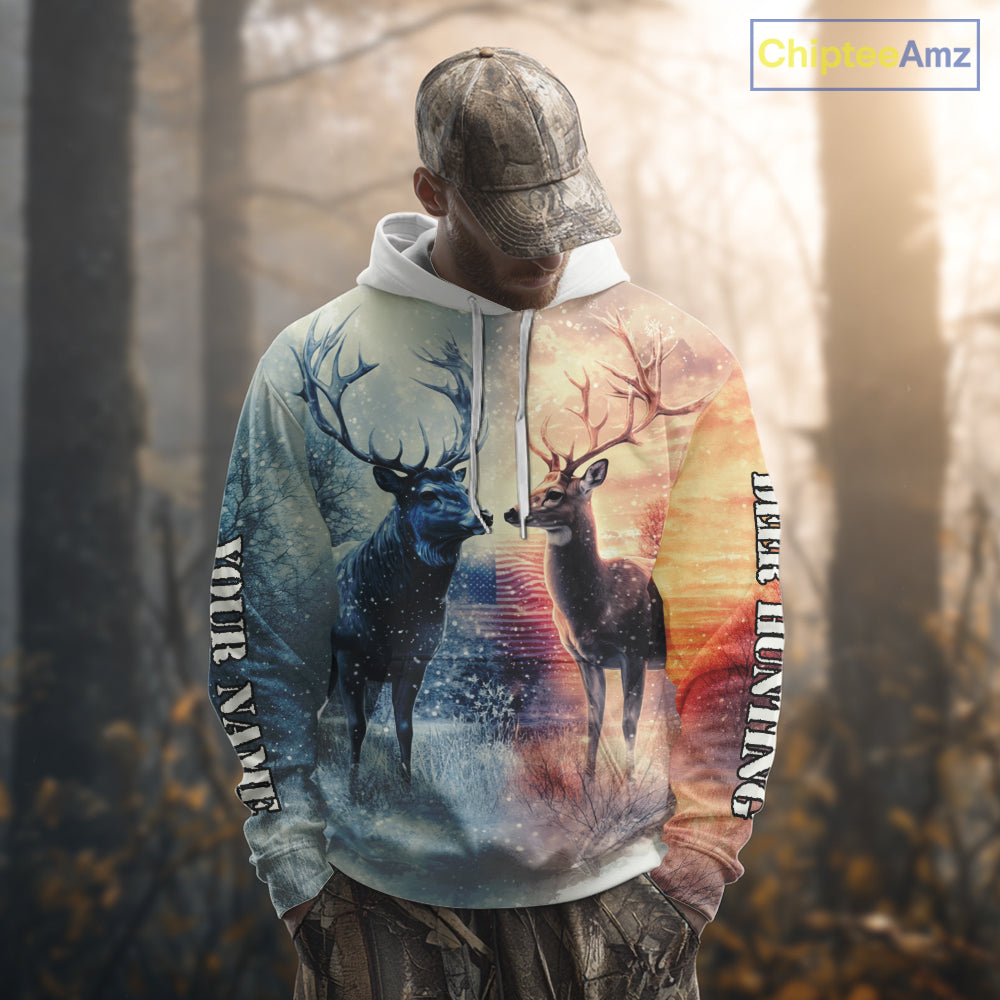 Deer Hunting in snow American flag Long sleeve, Hoodie Shirt NHT02