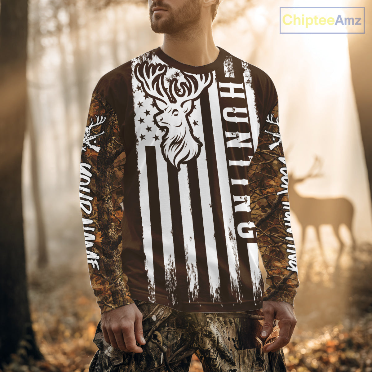 Personalized Brown Camo Deer Hunting Shirt with US Flag & Deer Buck, Hunter Gifts NBT59