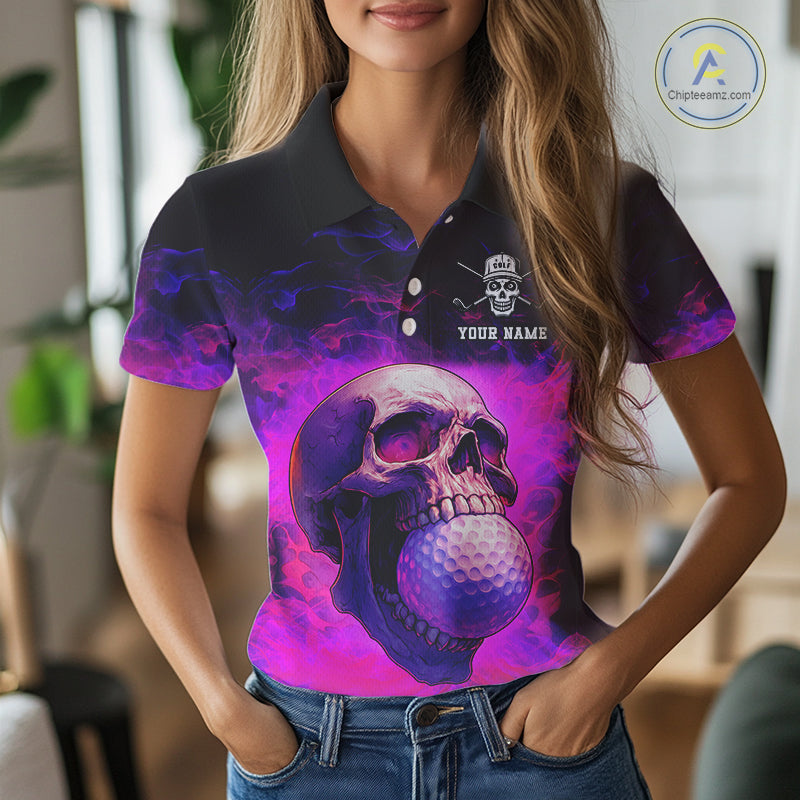 Custom Pink Flame Golf skull Halloween Women golf polo shirt, Personalized Team Skull golf outfit NQS10400