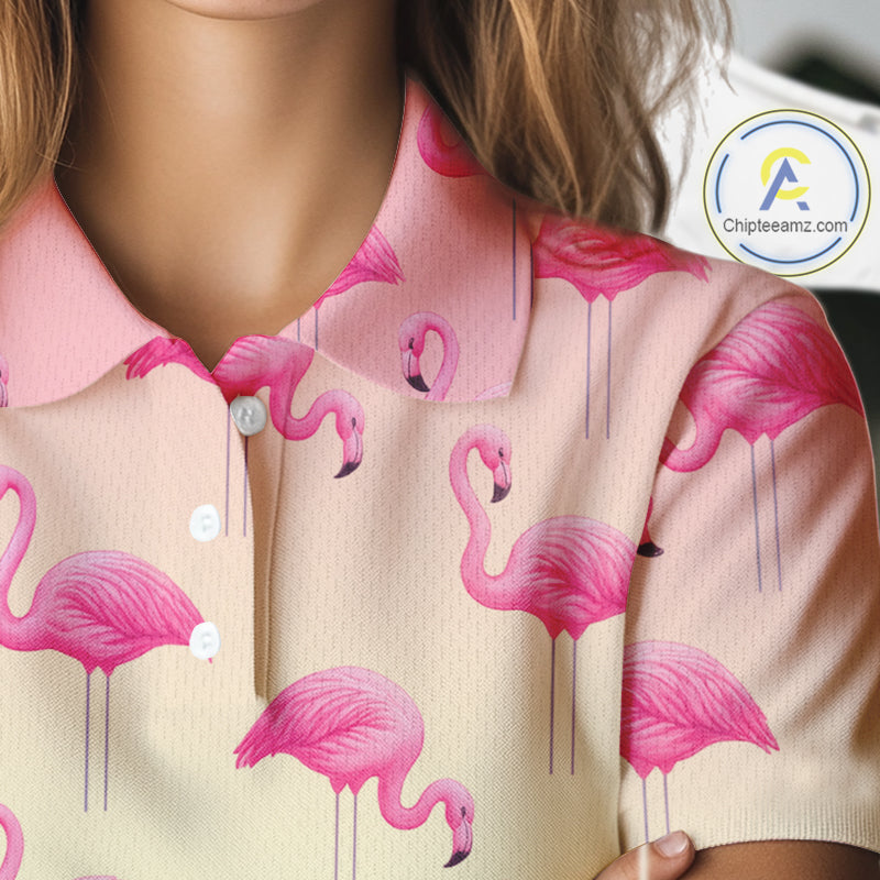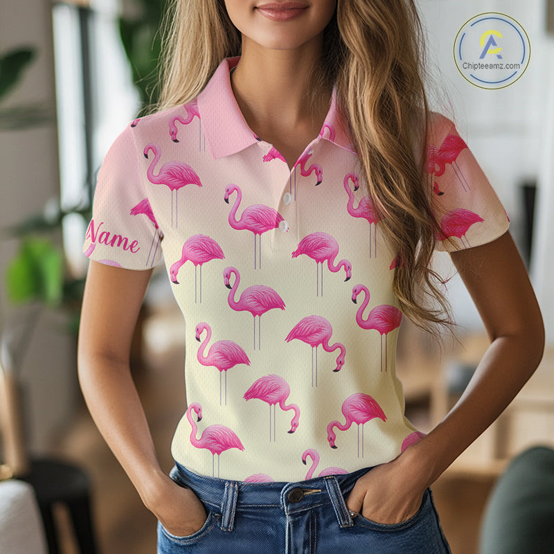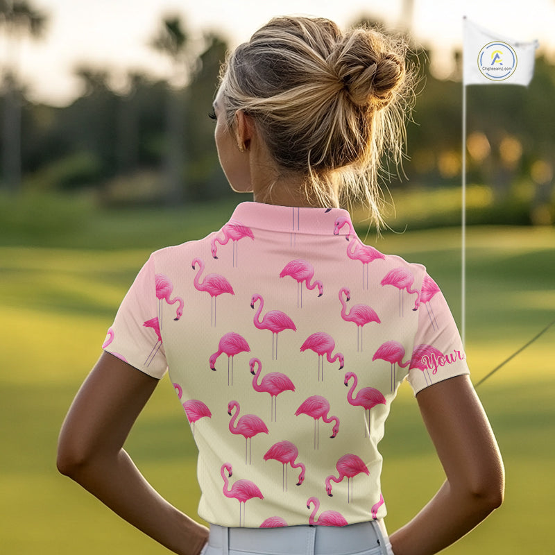 Personalized pink gradient Flamingo pattern Women golf polo shirt Custom golf team theme outfits NQS10324