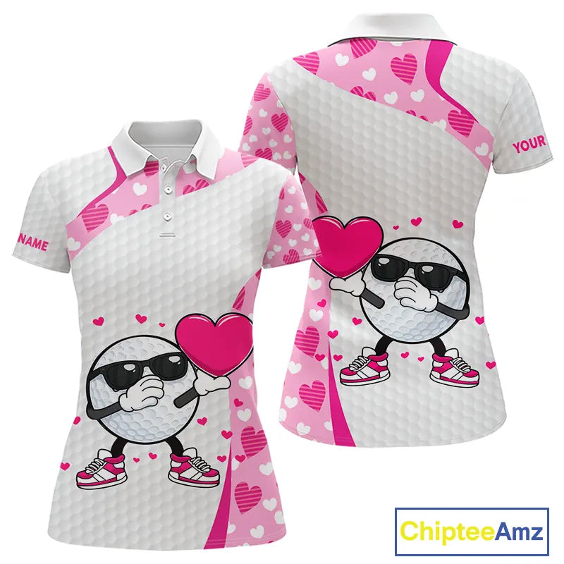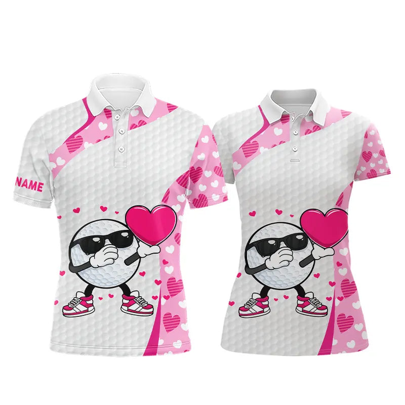 Personalized funny golf ball pink heart pattern matching golf polo shirts for couples, Valentine gift NQS11324