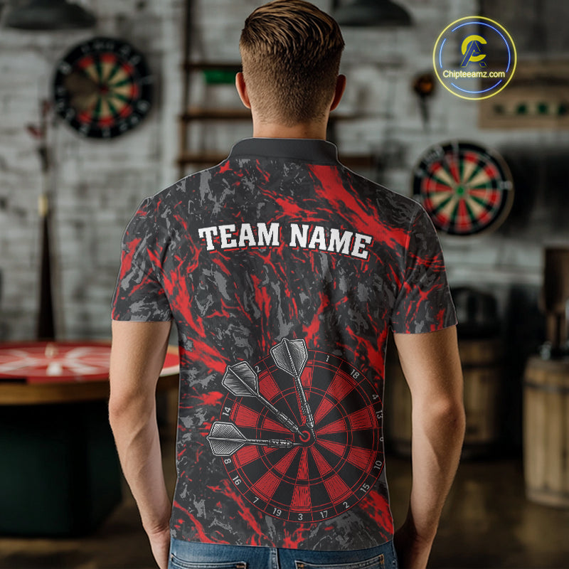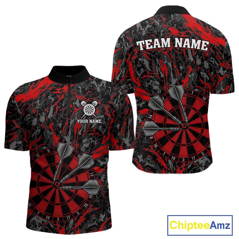 Custom Black And Red Grunge Camo Dart Shirts For Men, Camouflage Dart Team Jersey Polo & 1/4 Zip TDM3959