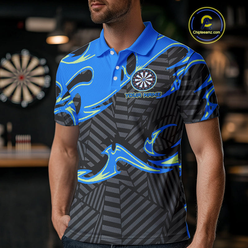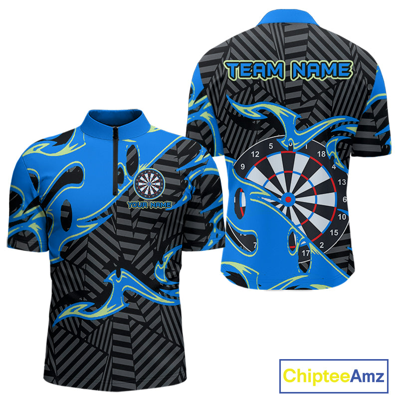 Custom Black And Blue Tribal Flame Dart Shirts For Men, Darts Team Jerseys Polo & Quarter Zip TDM3970