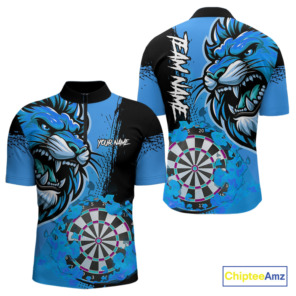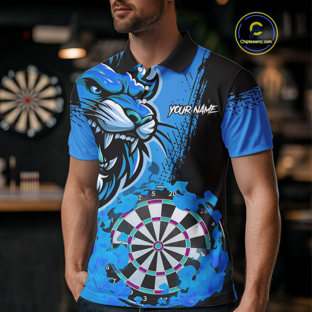 Blue Funny Darts Flame Lion Custom Polo & Quarter-Zip, Personalized Men Dart Shirts Dart Jerseys TDM3974