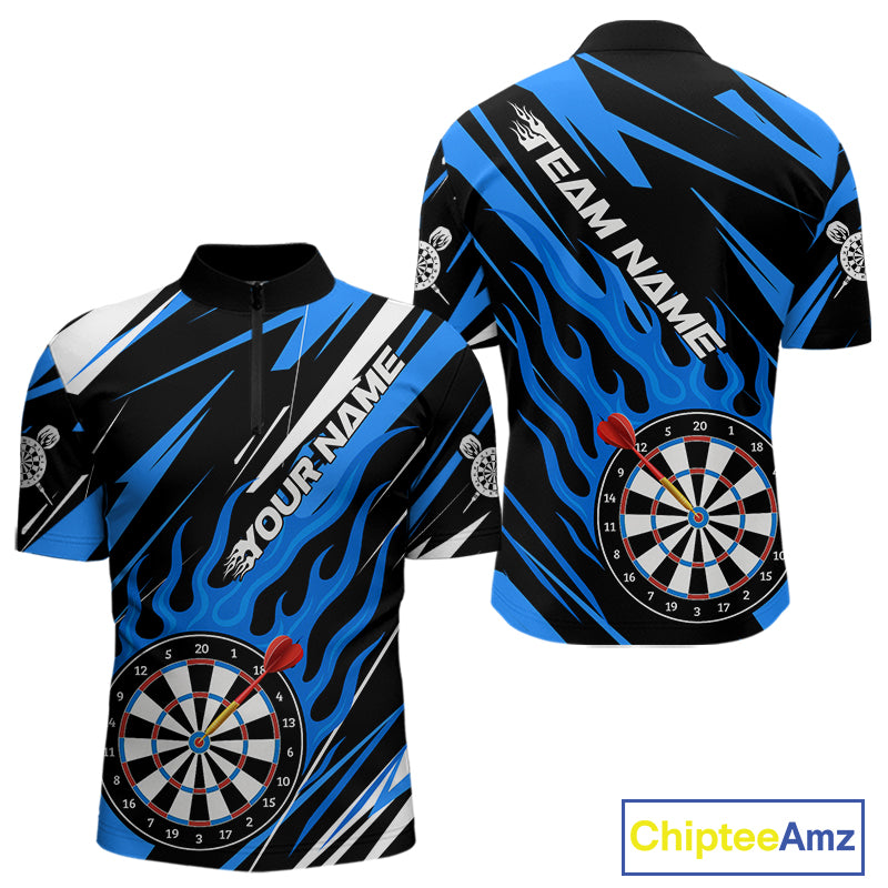 Blue Dartboard Flame Custom Dart Shirts For Men, Darts Team Jerseys Polo & Quarter Zip Shirts TDM4004