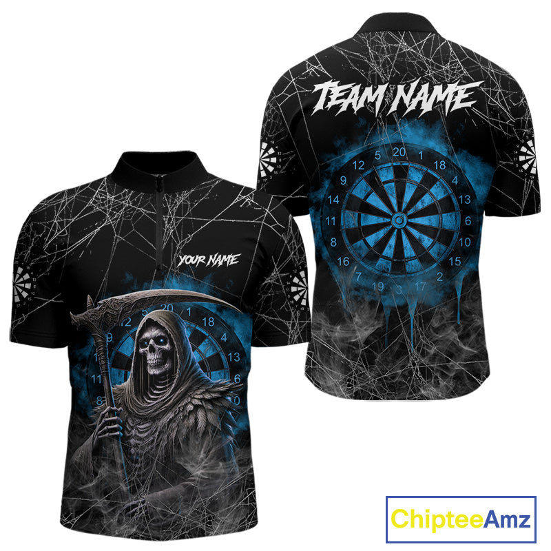Black And Blue Grim Reaper Smoke Funny Dart Shirts For Men Custom Dart Jerseys, Darts Clothing TDM4005