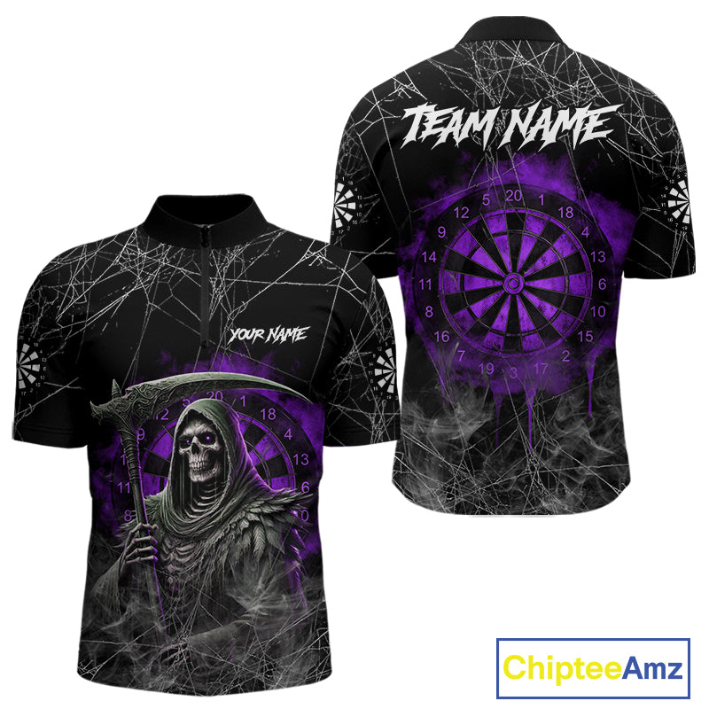 Black And Purple Smoke Grim Reaper Funny Dart Shirts For Men Custom Dart Jerseys, Darts Clothing TDM4006