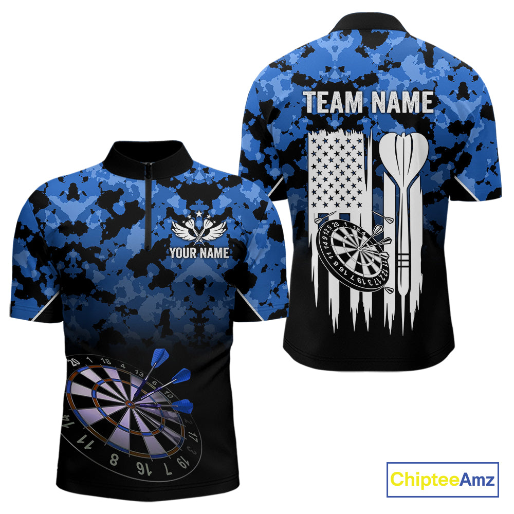 Personalized US Flag Blue Camo Dart Shirts For Men, Patriotic Darts Jersey Team Polo & 1/4 Zip TDM4128