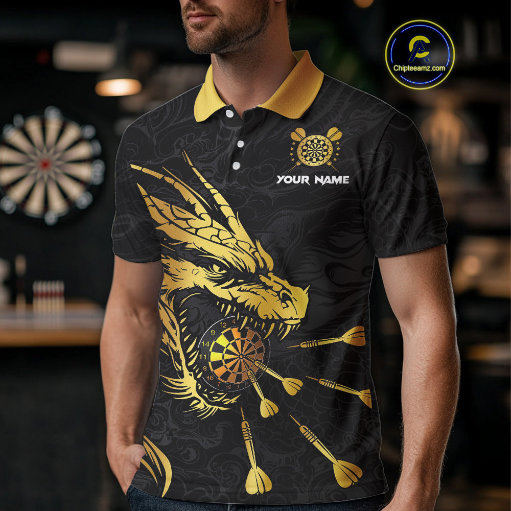 Personalized Black Gold Dragon Dart Shirts For Men Custom Darts League Team Jersey Polo & 1/4 Zip TDM4142