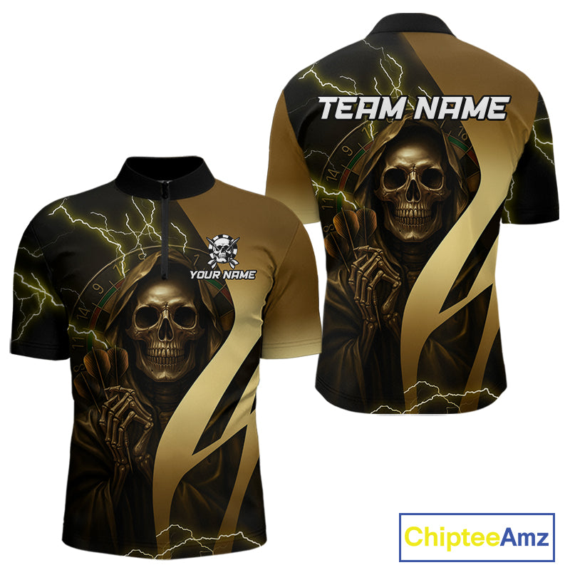 Personalized Golden Grim Reaper Lightning Darts Shirt For Men, Darts Team Jersey Polo &1/4 Zip TDM4271