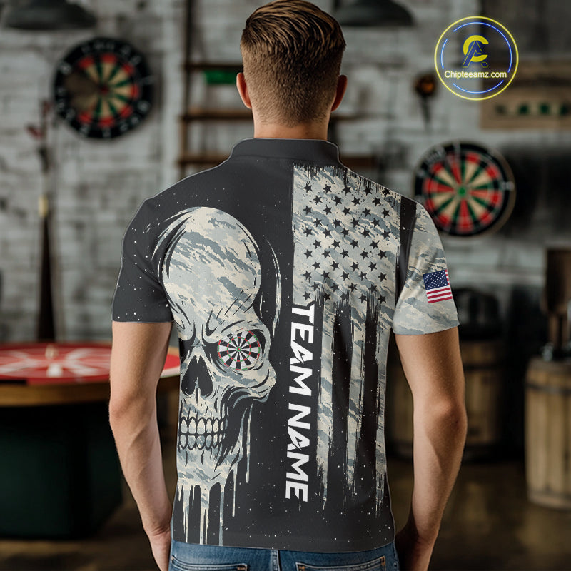 Grunge Camo Skull American Flag Dart Shirt For Men Custom Patriotic Dart Jersey Team Polo & 1/4 Zip TDM4277
