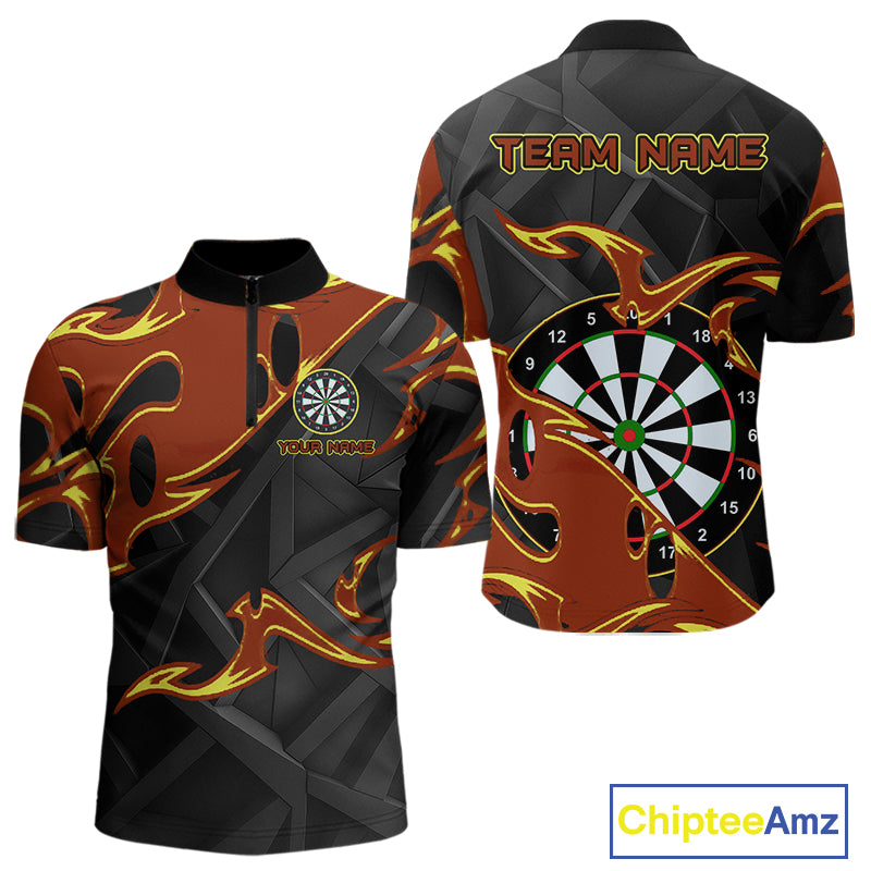 Custom Black And Orange Tribal Flame Dart Shirts For Men, Darts Team Jerseys Polo & Quarter Zip TDM4285