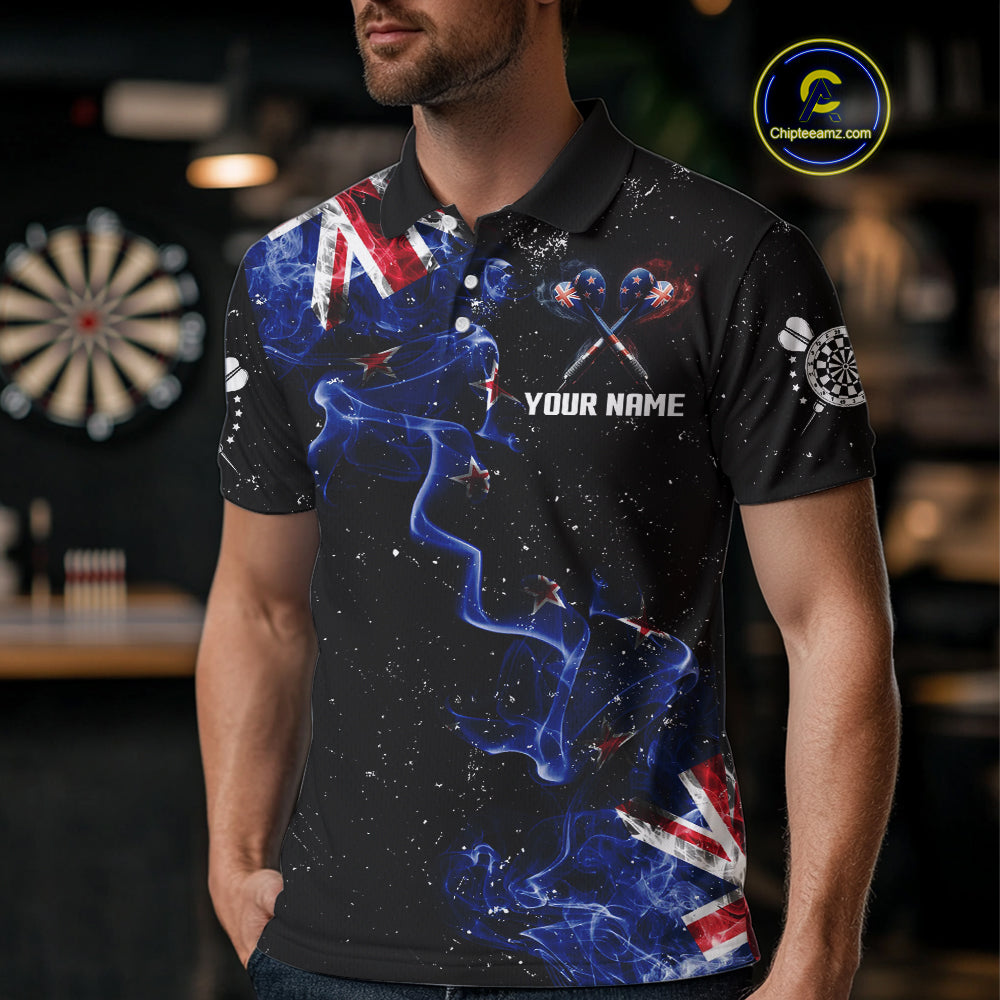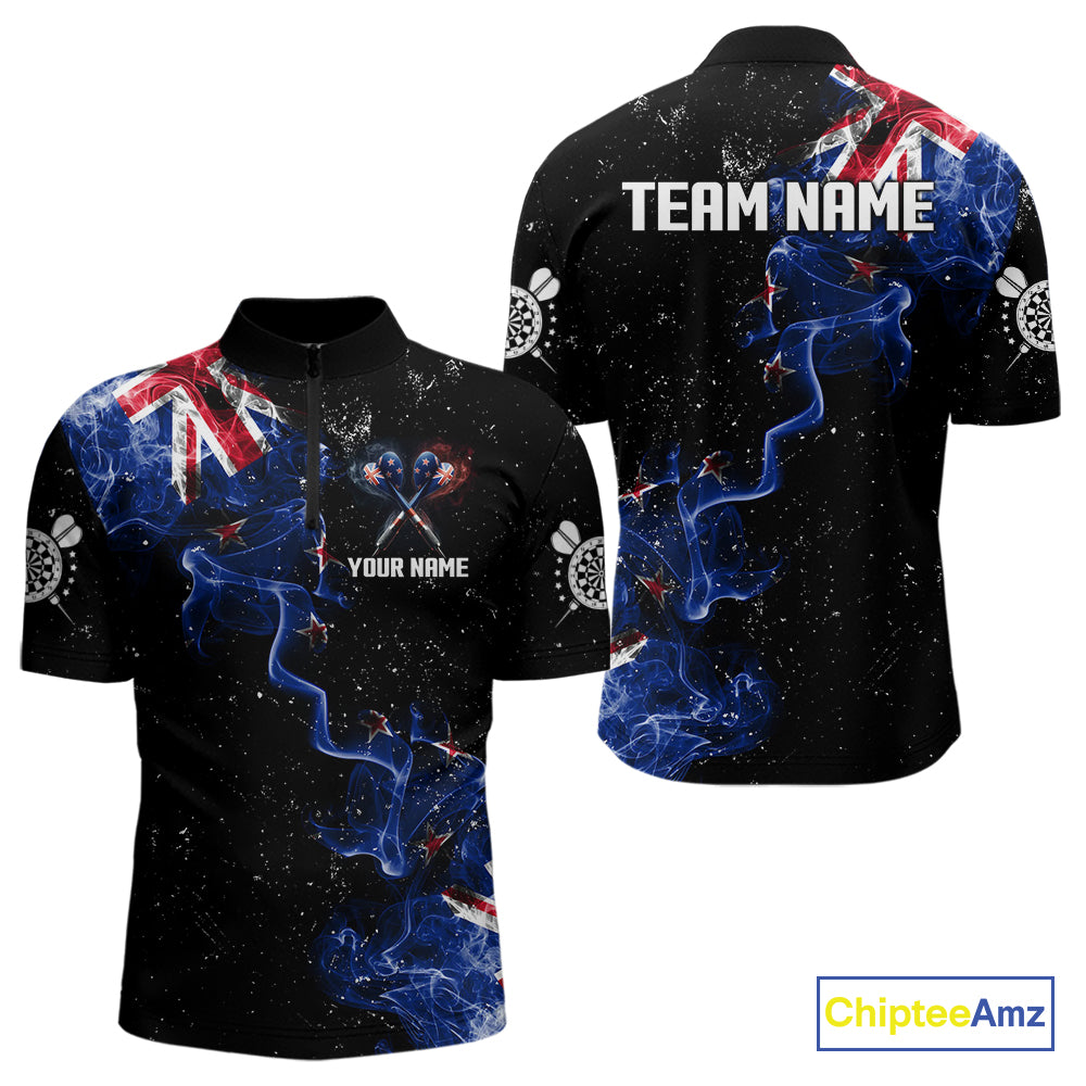 Customized Grunge New Zealand Flag Smoke Darts Polo & 1/4 Zip, Patriotic Darts Jerseys For Men TDM4289