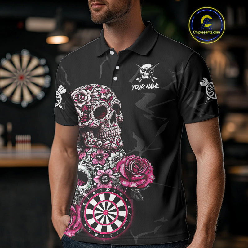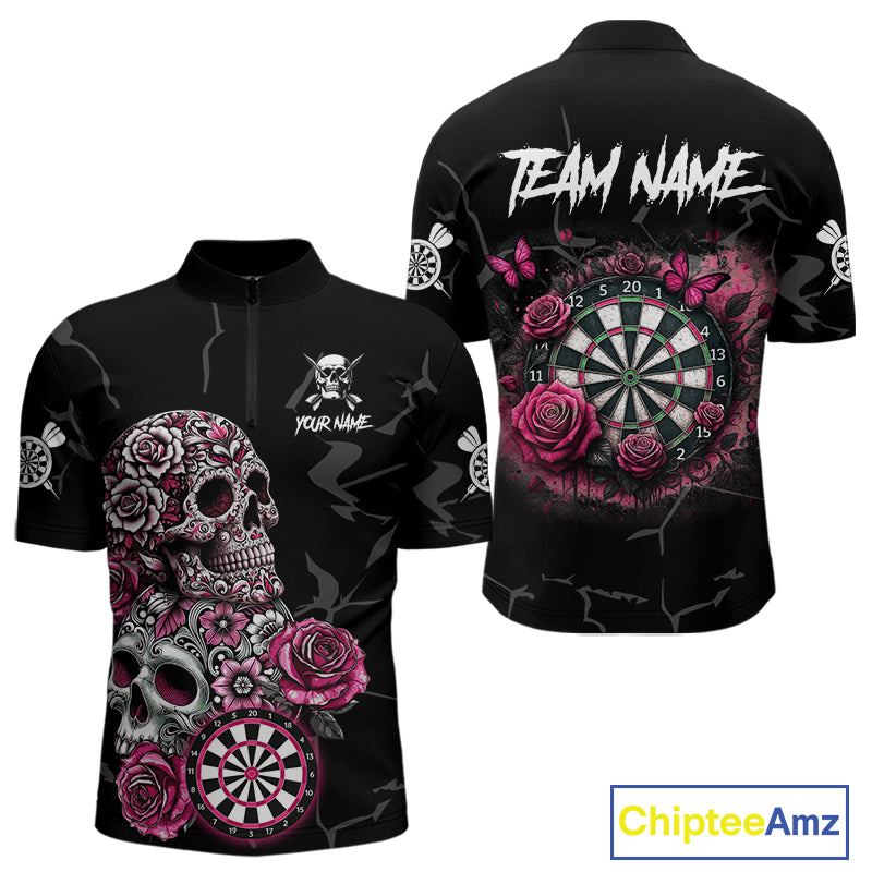 Personalized Pink Funny Skull Roses Darts Shirt For Men Custom Darts Team Jersey, Darts Outfit TDM4354