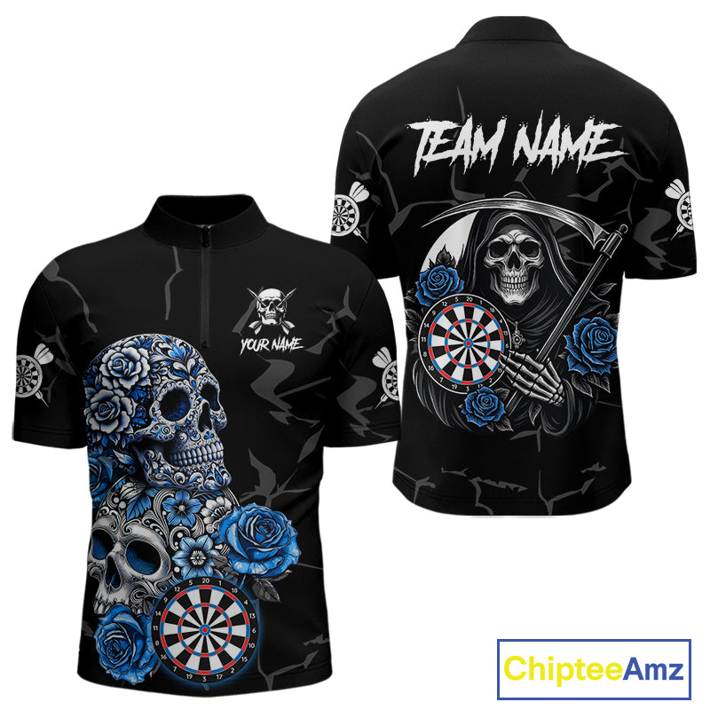 Personalized Blue Funny Skull Roses Darts Shirt For Men Custom Darts Team Jersey, Darts Outfit TDM4355