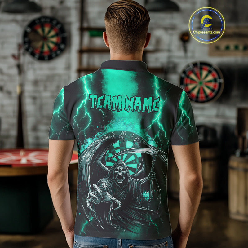 Personalized Turquoise Grim Reaper Thunder Lightning Darts Shirt For Men, 3D Darts Team Jerseys TDM4589