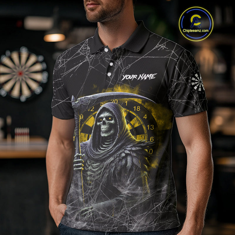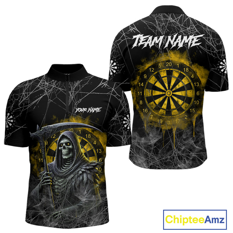Black And Yellow Smoke Grim Reaper Dart Shirts For Men Custom Halloween Darts Jersey Outfit TDM4591