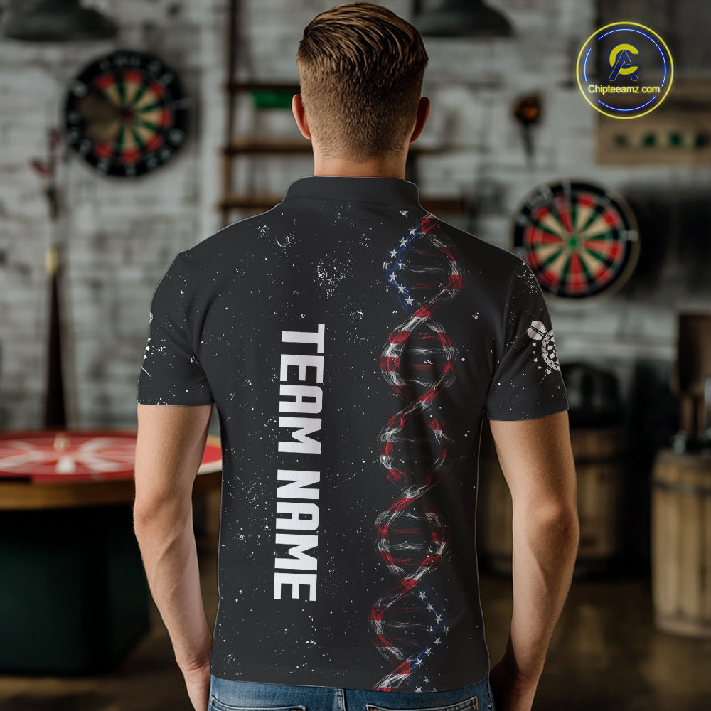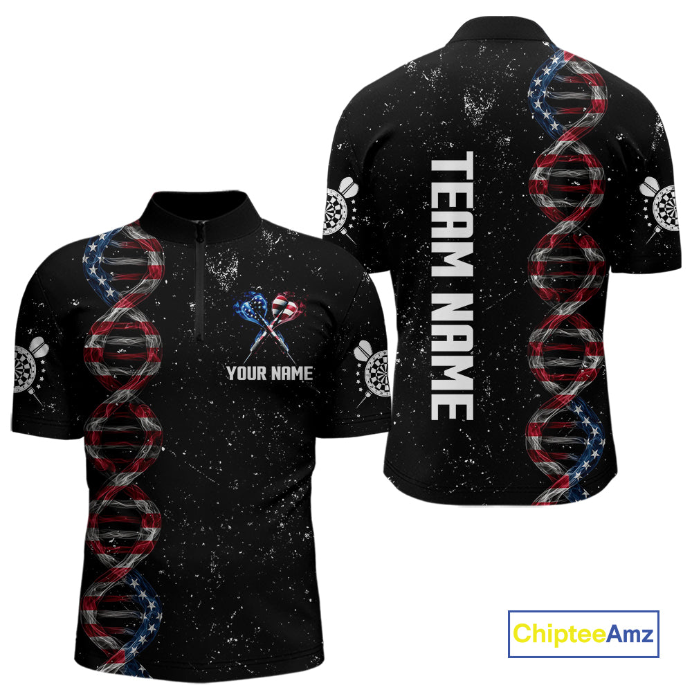 Custom Men's Black Grunge DNA American Flag Smoke Darts Shirt, Patriotic Dart Jersey Polo, 1/4 Zip TDM4628
