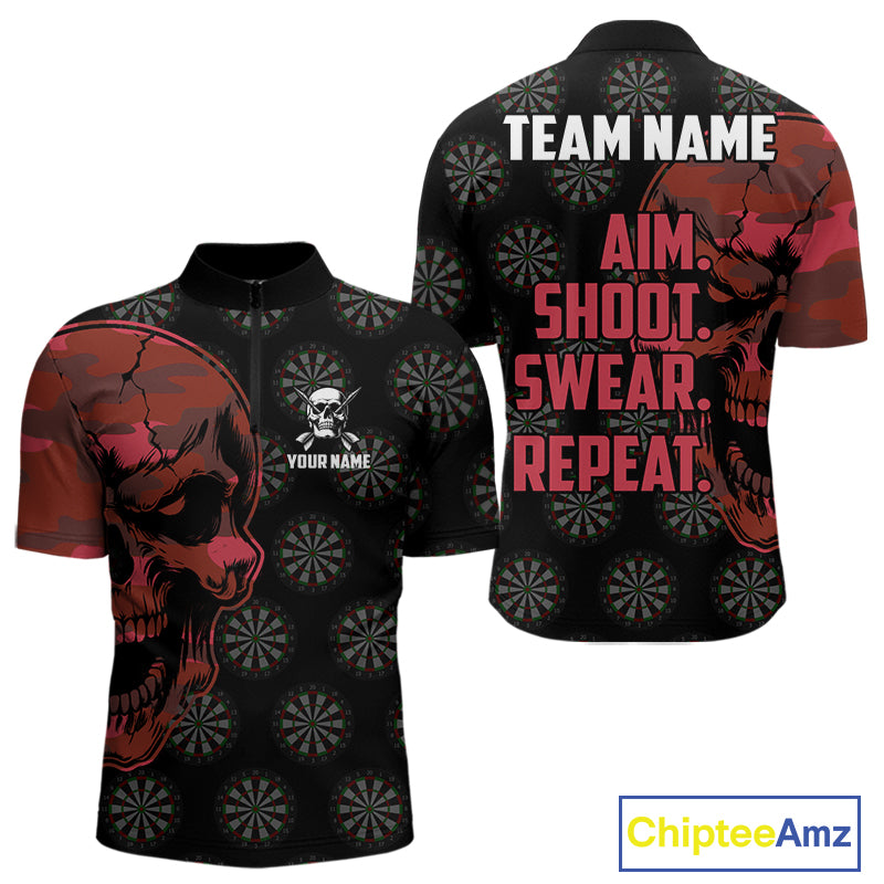 Funny Red Camo Darts Skull Aim Shoot Swear Repeat Custom Dart Shirts For Men, Darts Team Jersey TDM4797