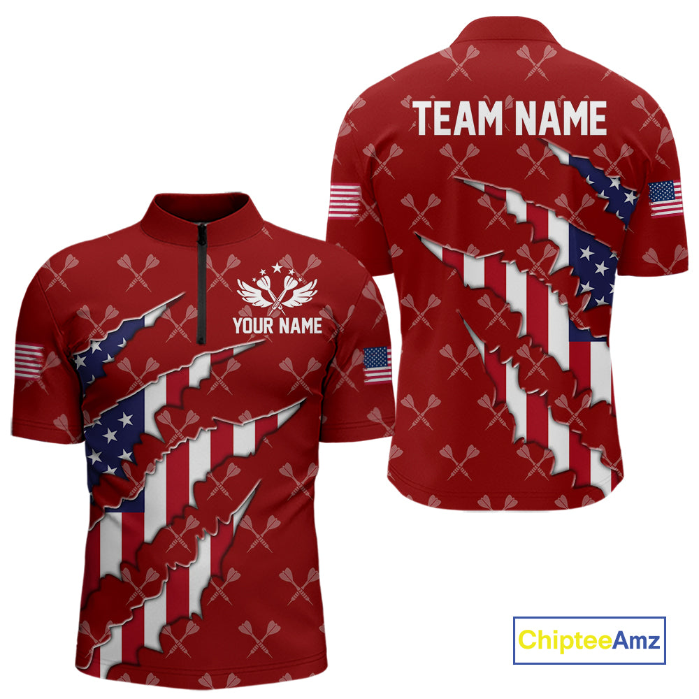 Personalized American Flag Red Dart Pattern Polo & Quarter Zip For Men, Patriotic Darts Jersey TDM4997