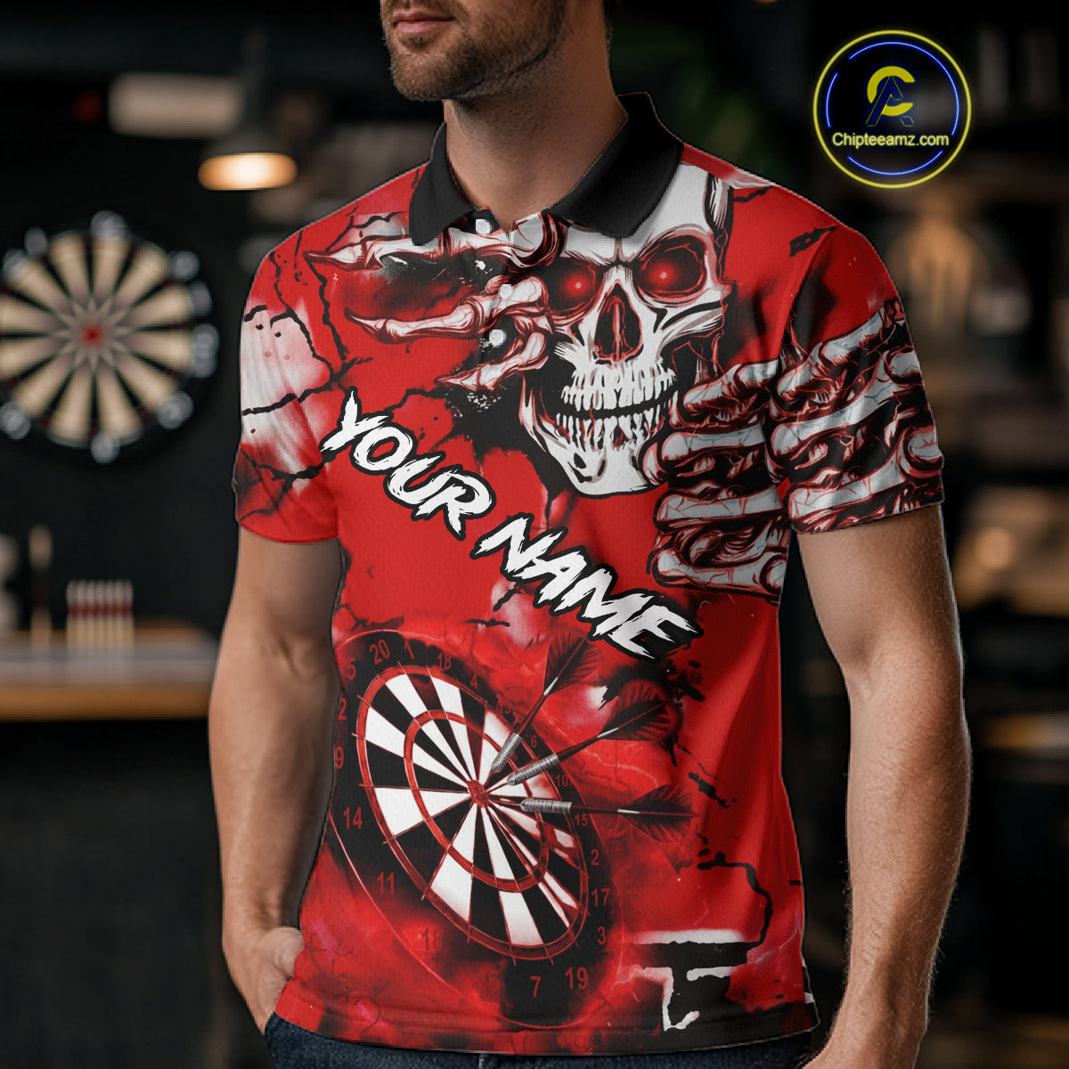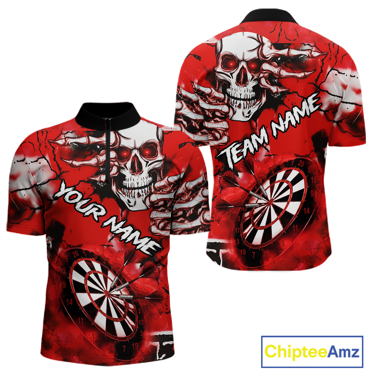 Personalized Red Grunge Skull Darts Shirt For Men Custom Darts Team Jersey Polo & Quarter Zip TDM5028