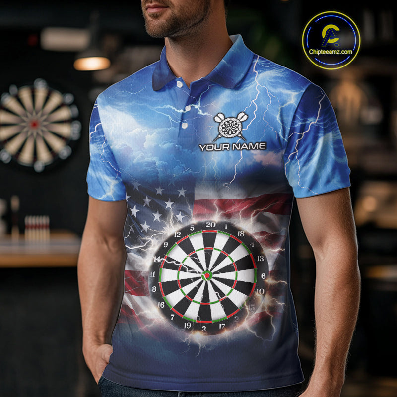 Blue American Flag Thunder Lightning Darts Shirt For Men Custom Darts Jersey Team Polo & 1/4 Zip TDM5270