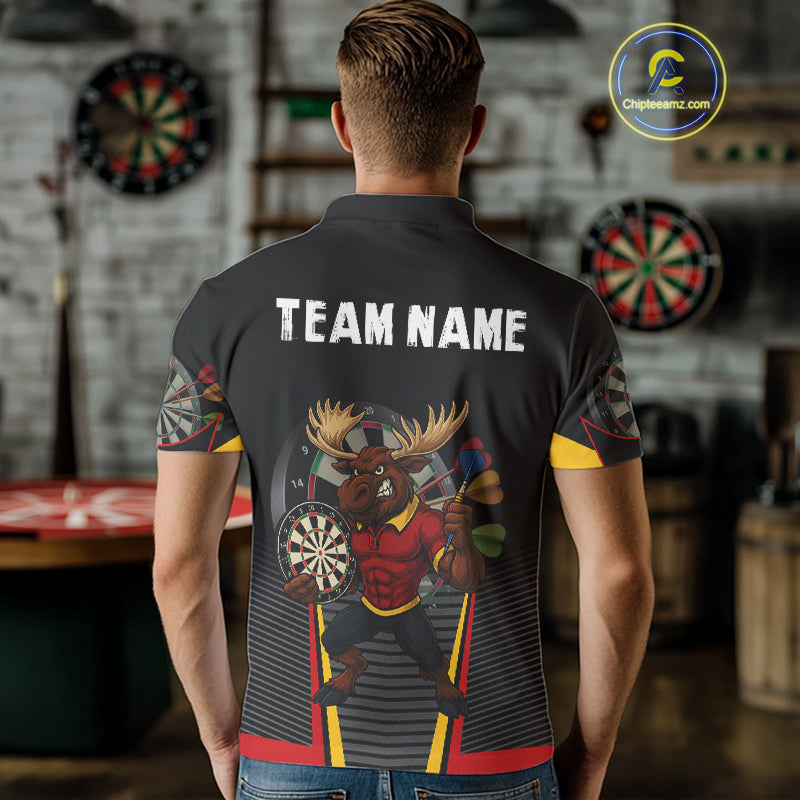 Black and Red Funny Moose Darts Polo, Quarter Zip Shirts For Men Custom Darts Team Jerseys NQS11065