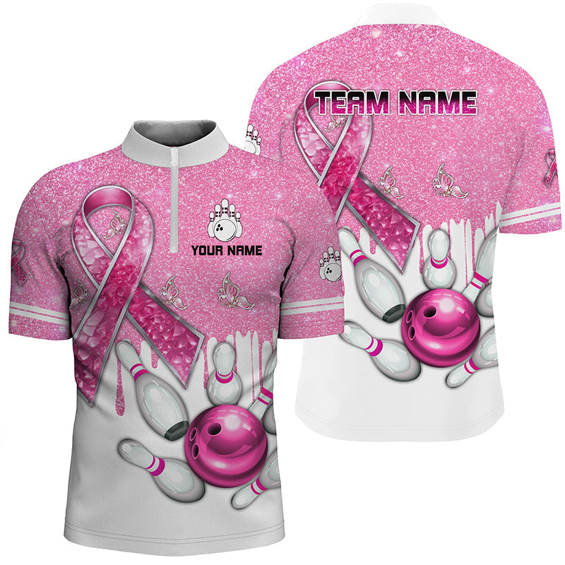 Pink ribbon glitter Bowling Shirts For Men Custom team bowling jerseys, breast cancer bowling shirts NQS8251