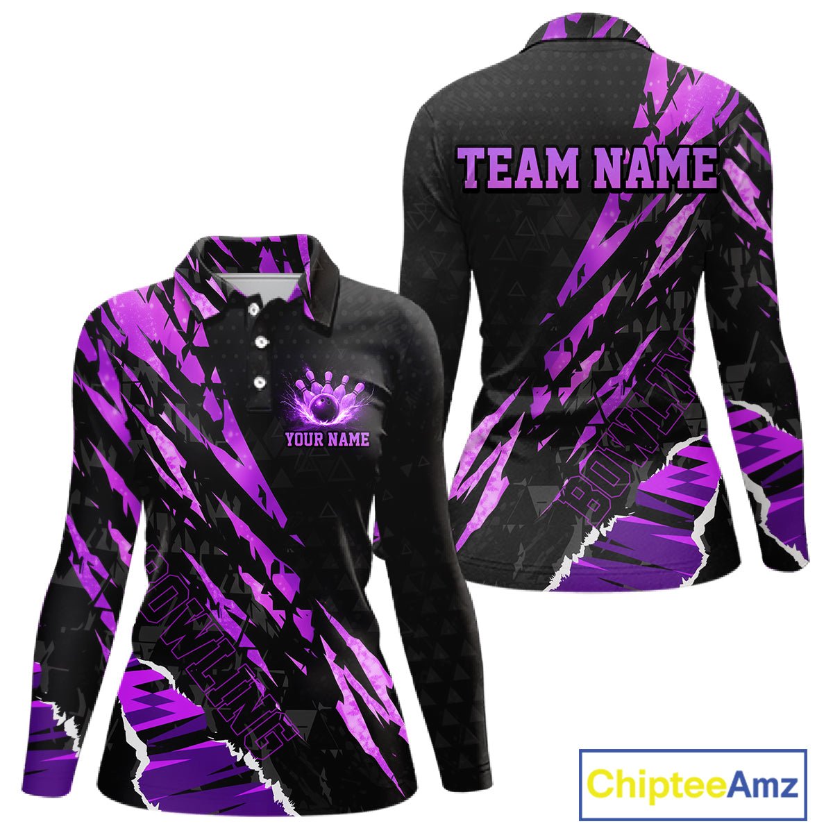 Black and Purple camo Bowling Polo shirts, 1/4 zip shirt for Women custom Bowling Team League Jerseys NQS11420