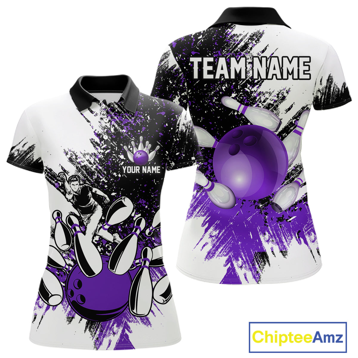Black & White Women Bowling Polo, 1/4 Zip Shirts Custom bowling jersey, girls bowling outfit | Purple NQS11307