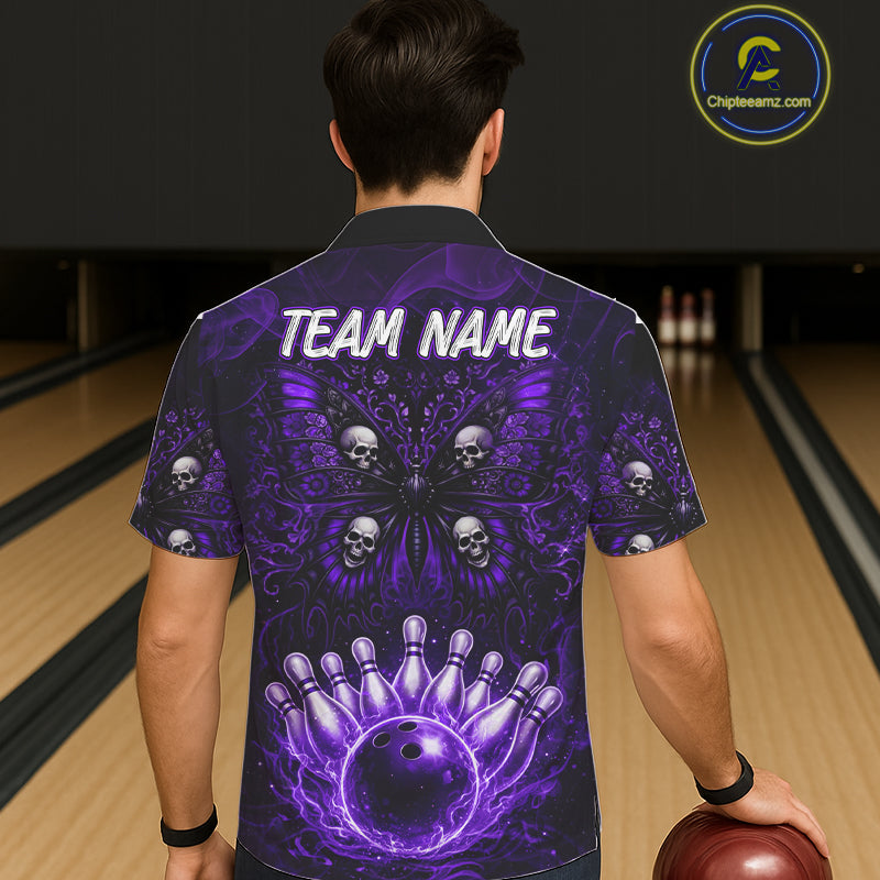 Custom Black & Purple bowling jersey Butterfly skull Bowling Team Shirts, button up bowling shirts NQS11367