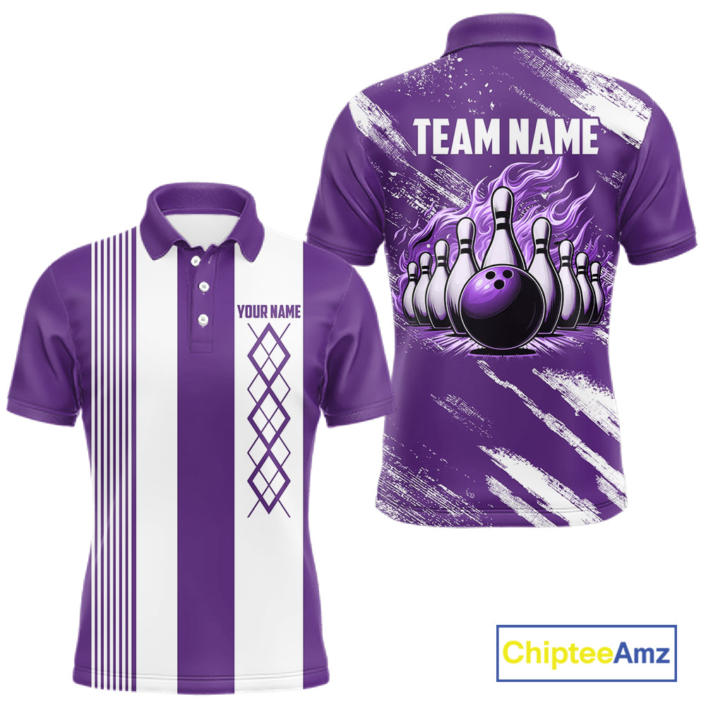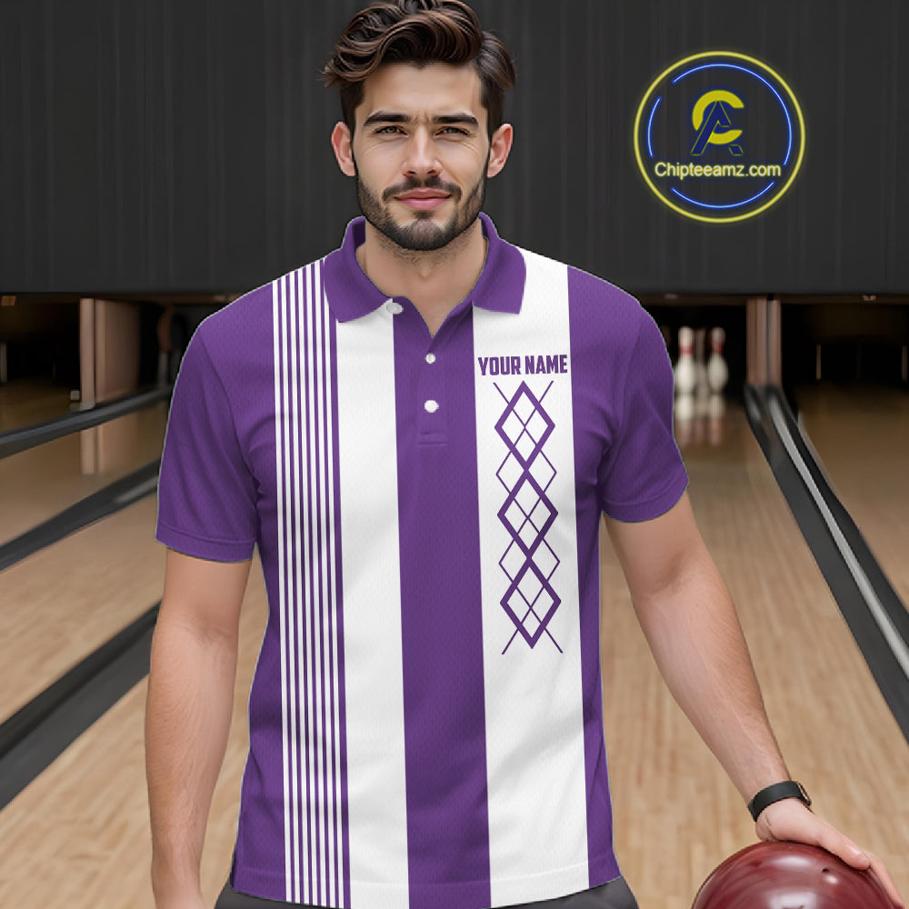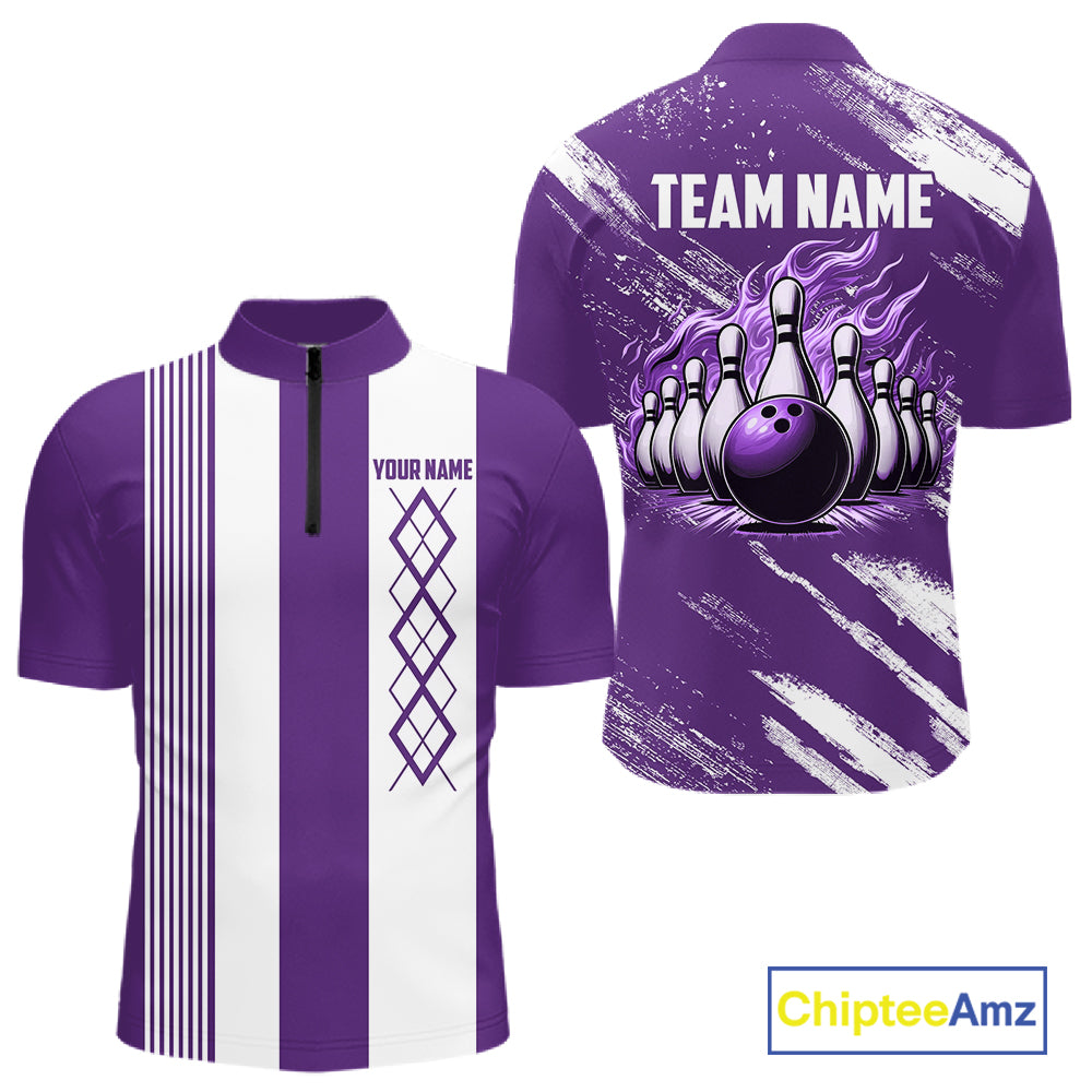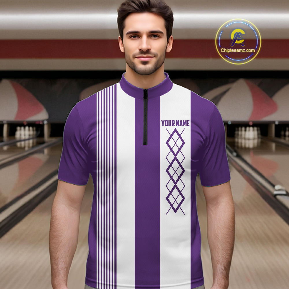 Purple & White retro Argyle Flame bowling Men Polo, 1/4 Quarter Zip Shirts Custom bowling team jersey NQS11314