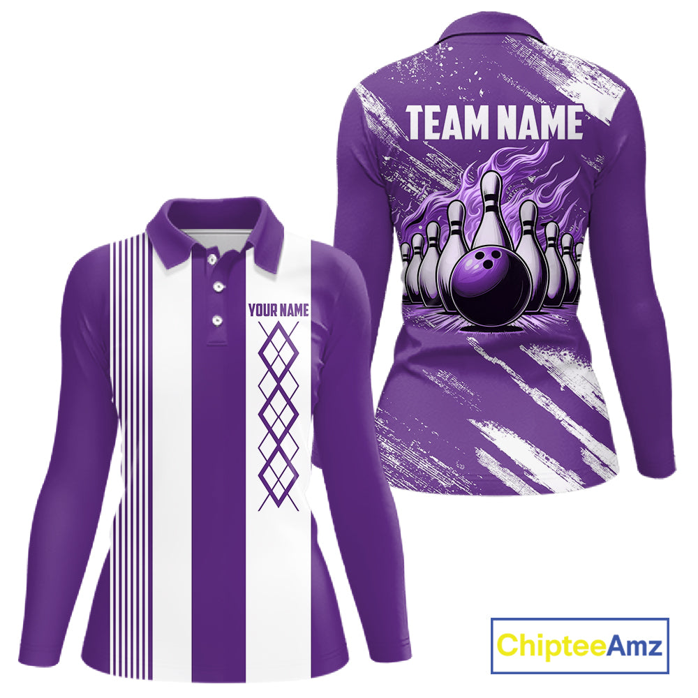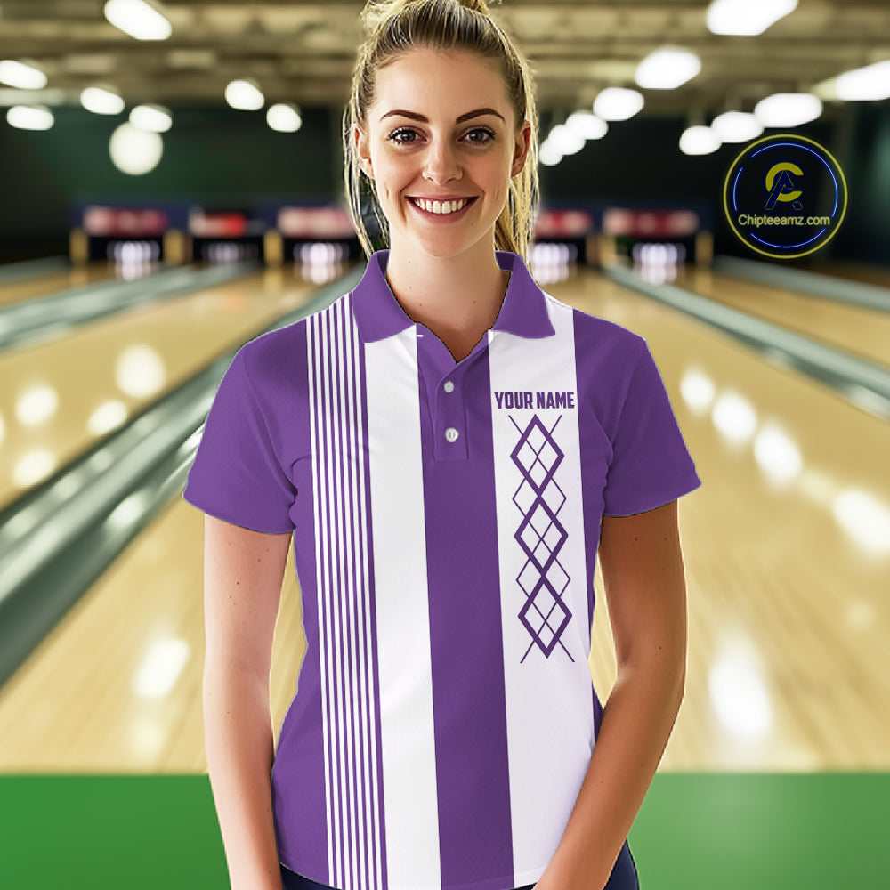 Purple & White retro Argyle Flame bowling Women Polo, 1/4 Zip Shirts Custom bowling team jersey NQS11314