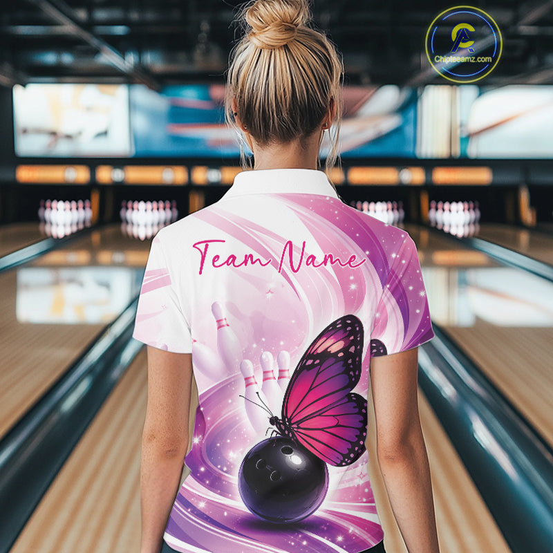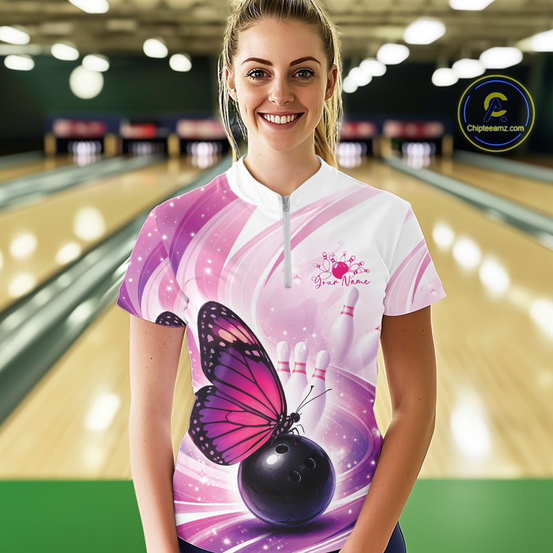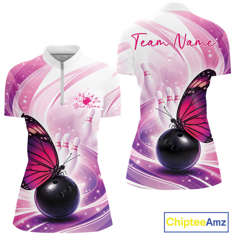 Custom Pink And Purple Butterfly Bowling Women Quarter-Zip Shirt, Ladies Bowling Shirt IPHW10311
