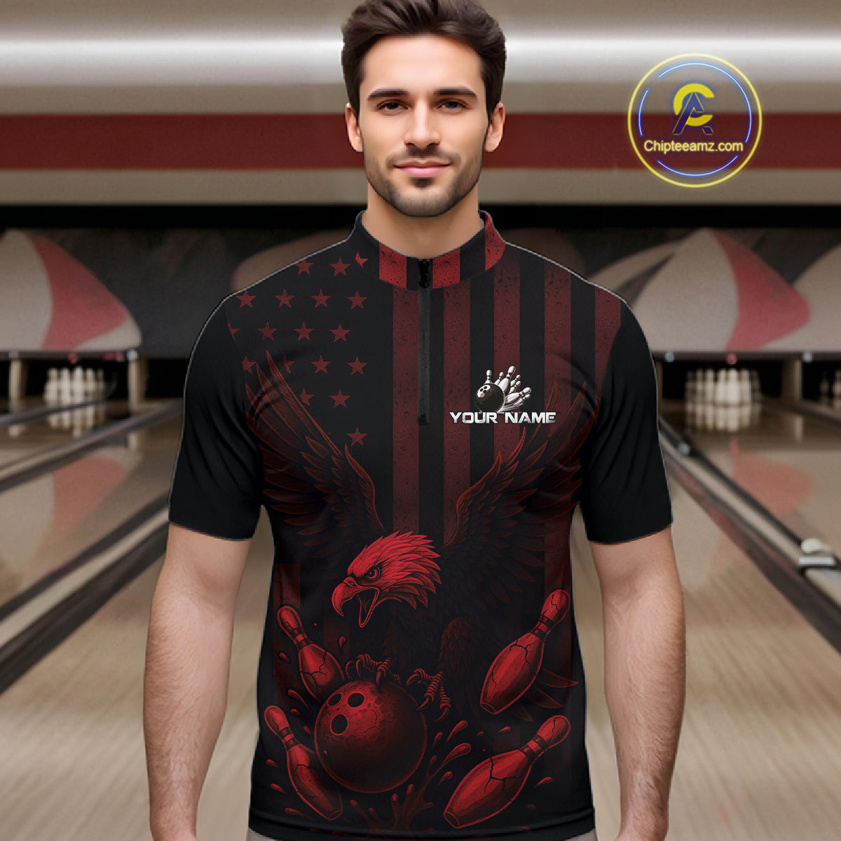 Black and Red American Flag Eagle Bowling Shirt For Mens Custom Patriotic Team bowling jerseys NQS10480